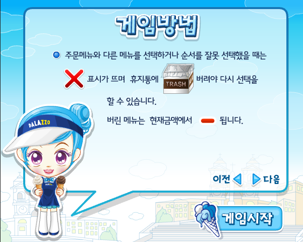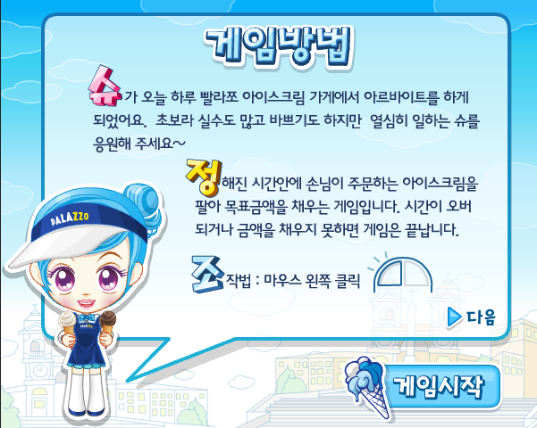 슈가 빨라쪼 아이스크립 가게에서 알바를 하는 플래시게임입니다.